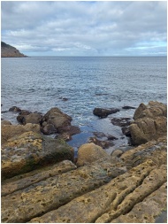 Rocky coastal view with dramatic clouds and serene ocean horizon.