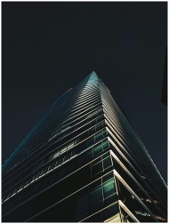 Low-angle shot of a modern skyscraper in Buenos Aires, showcasing its sleek design against the night sky.