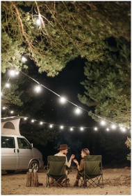 A couple enjoys a quiet night camping under string lights by a van amidst green trees.