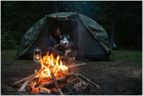 Cozy camping scene with a man and his dog by a cam