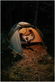 A couple enjoying a cozy evening inside a tent in