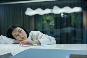 Asian woman in glasses rests her head on a counter with papers, showing signs of fatigue.