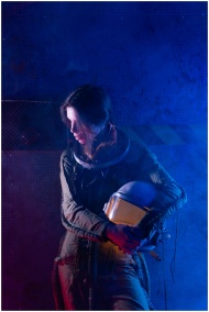 A futuristic portrait of a woman in a spacesuit amidst blue and red lighting, holding a helmet.