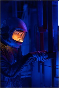 A woman astronaut in a spacesuit exploring a visually striking sci-fi environment with vibrant lights.