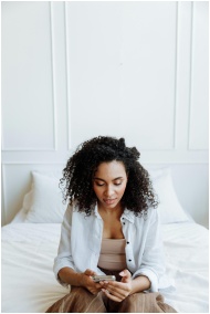 A young woman with curly hair using her smartphone while sitting on a bed in a well-lit white room.