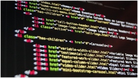 Close-up of HTML code highlighted in vibrant colors on a computer monitor.