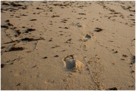 Footprints lead across a seaweed-dotted sandy beac