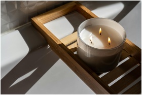A minimalist setting with a lit candle on a wooden tray, casting warm shadows and creating a soothing ambiance.