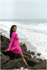 Woman in a pink dress sitting on rocks by the ocea