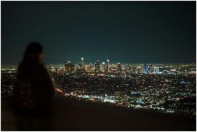A breathtaking view of the illuminated Los Angeles skyline at night with a blurred person in the foreground.
