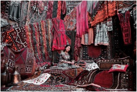 A vibrant display of traditional Turkish rugs and textiles in an indoor market.