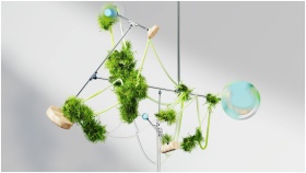 Abstract art installation featuring moss and futuristic design elements, highlighting balance and growth.