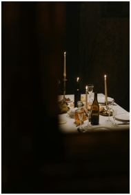 Moody candlelit dinner table with wine, cutlery, and vintage decor for an intimate gathering.