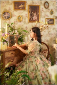 A woman in a floral dress sits in an ornate Victorian-style room surrounded by art and flowers.