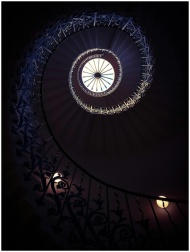 Captivating view of a spiral staircase with intricate railing and skylight in London.