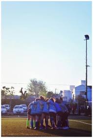 A women's soccer team huddling on the field at sunset in Córdoba, Argentina.
