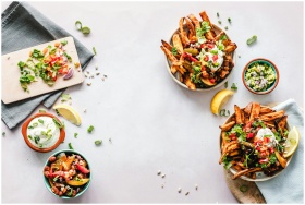 Colorful flat lay featuring sweet potato fries, guacamole, and fresh veggies, perfect for a healthy meal.
