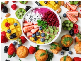 Vibrant smoothie bowl topped with assorted fresh f