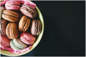 A bowl of assorted colorful macarons on a dark table. Perfect for dessert inspiration.