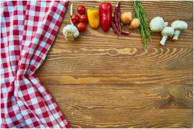 Fresh vegetables and spices on a rustic wooden table with checkered cloth.