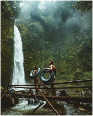 A couple in swimwear with float tubes exploring a lush waterfall in Bali, Indonesia.