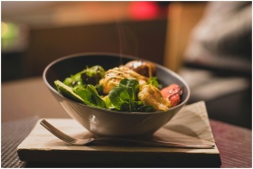 Delicious bowl of salad with fresh greens and grilled chicken served on a wooden platter.