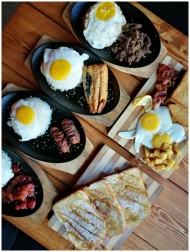 An appetizing breakfast spread featuring eggs, mea