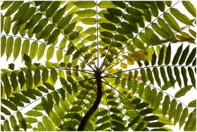 Beautiful view from below of lush tropical leaves creating a natural canopy.
