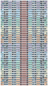 A colorful, modern residential building exterior in Hong Kong, emphasizing urban architecture.