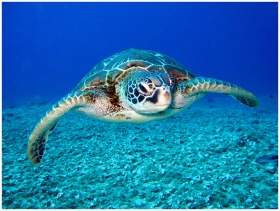 Close-up of a sea turtle gracefully swimming under