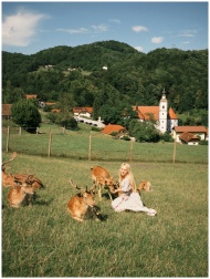 A woman sits among deer in a picturesque Slovenian