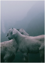 Two white goats graze peacefully in a misty mounta