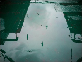 Seagulls fly over a water puddle reflecting urban