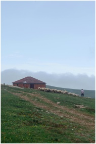 A pastoral scene with sheep grazing by a brick house on a countryside hill.