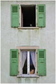 Two cats sitting in windows of a Swiss building with green shutters, creating a charming facade view.