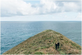 A couple enjoys a scenic hike on a grassy cliff path overlooking the ocean.