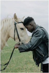 A touching moment between a black man in a leather jacket and a white horse in a green meadow.
