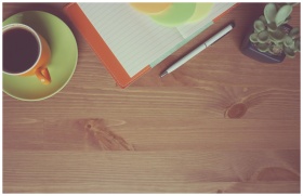 A warm-toned workspace with a cup of coffee, notebook, pen, and succulent on a wooden table.