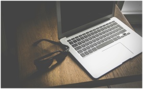 A stylish wooden desk featuring a sleek laptop and sunglasses in a modern workspace.