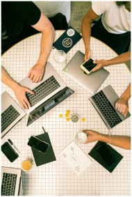 Top view of a team collaborating with laptops, phones, and notes in a modern office.