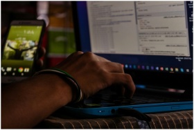Close-up of a person working on a laptop and smartphone in a dimly lit office, showcasing remote work.