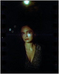 Captivating night portrait of a woman in a sparkling dress, shot on film in a moody atmosphere.