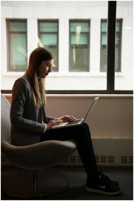Woman sitting on a chair using a laptop by the win