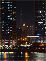 Captivating night cityscape of Dubai with Burj Khalifa amidst skyscrapers reflecting on water.