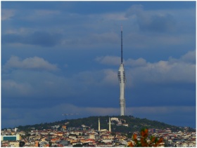 Scenic view of Istanbul cityscape featuring a prominent telecommunications tower under a cloudy sky.