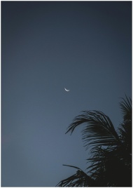 Crescent moon in night sky with silhouette of palm
