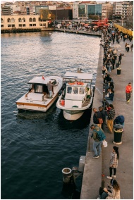 Crowded waterfront with boats and people at Golden Horn quay, Istanbul.