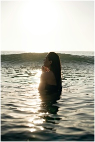 Side view of tranquil young female tourist with long dark hair standing in waving ocean with closed eyes and enjoying summer sunset