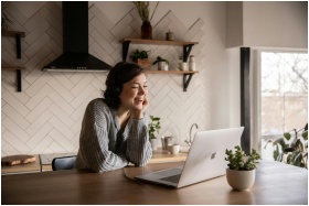 Young cheerful female smiling and talking via laptop while sitting at wooden table in cozy kitchen