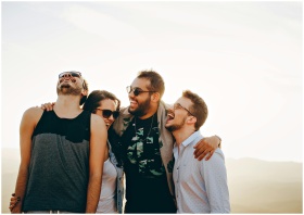 A group of young adults laughing and enjoying time together outdoors under the sun.